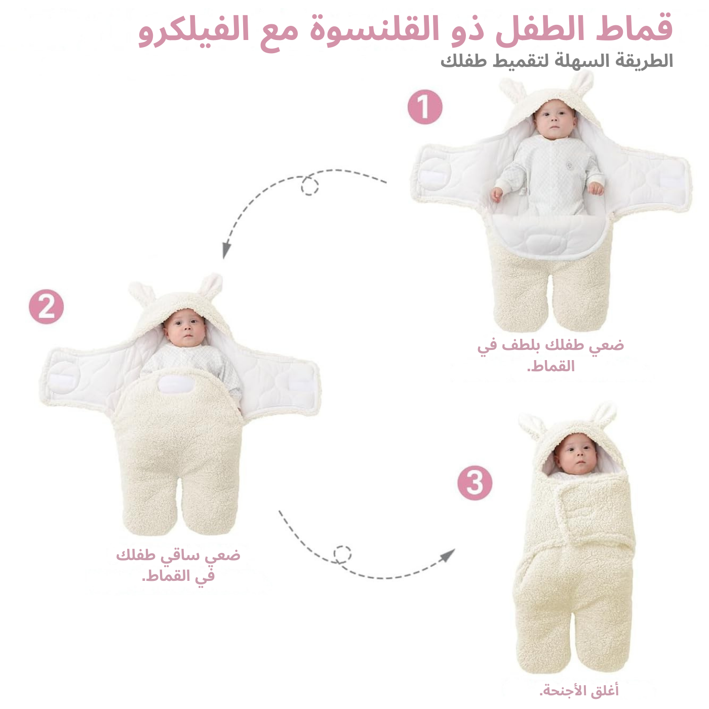 إغلاق فيلكرو قابل للتعديل: شكل الجناح الناعم للبطانية المزودة بغطاء للرأس يعانق طفلك مثل ذراعي الأم، وتضمن أحزمة الفيلكرو القابلة للتعديل أن يكون طفلك ملفوفًا بشكل مريح ويبقى دافئًا حتى يتمكن من النوم بشكل مريح. يسمح لك التصميم بتعديل إحكام اللفاف بسهولة لتناسب احتياجات طفلك.