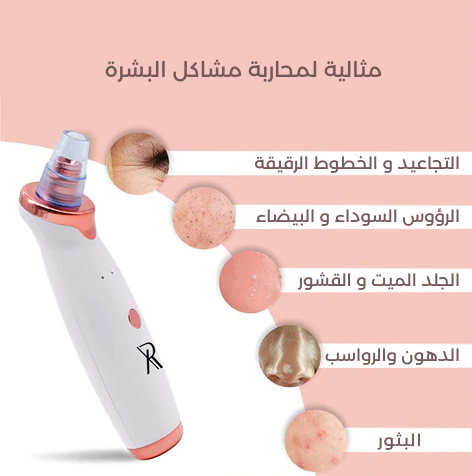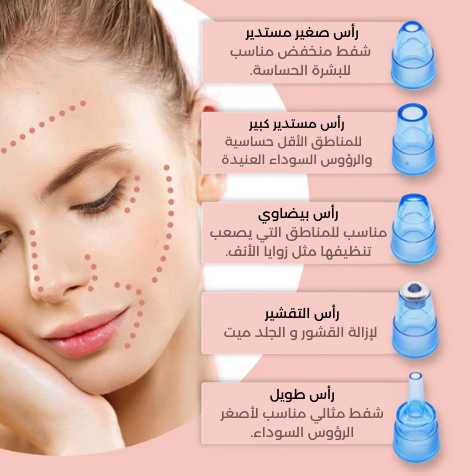 خمسة رؤوس شفط مختلفة باستخدامات متعددة يمكنها تنظيف أي ركن من أركان الوجه مما يجعل البشرة ناعمة و مشرقة ويعطيها انتعاش وحيوية