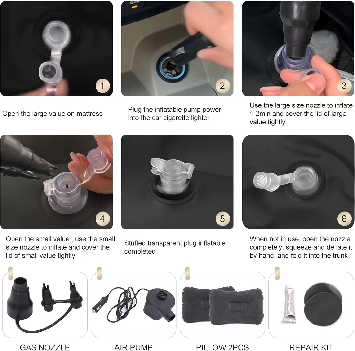 تأتي مرتبة السيارة القابلة للنفخ للمقعد الخلفي مزودة بمضخة يمكنك توصيلها بولاعة السجائر في سيارتنا. يتم نفخه بسرعة خلال دقيقتين.
